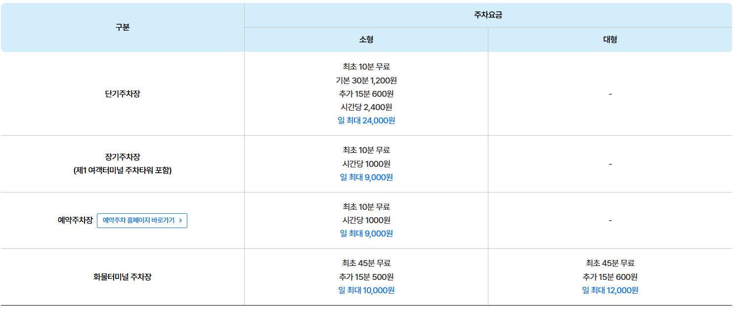 장기주차장은 터미널에서 셔틀로 약 5~10분 거리에 위치하며, 예약이나 할인 정보는 공식 사이트확인하세요. 실제 요금은 변동될 수 있으니 현장에서 재확인하는 것을 권장합니다.